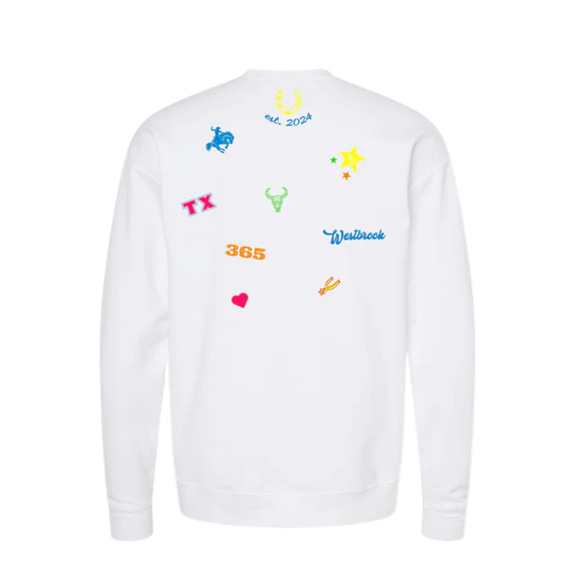 Add a pop of personality to your wardrobe with the Westbrook Confetti Crewneck. The front features a bold, retro-inspired Hudson Westbrook logo in layered blue and yellow for a vibrant, throwback vibe. Turn around and the back bursts to life with a fun mix of colorful graphics—stars, bulls, hearts, and western charms—all celebrating the unique style and spirit of Hudson Westbrook.